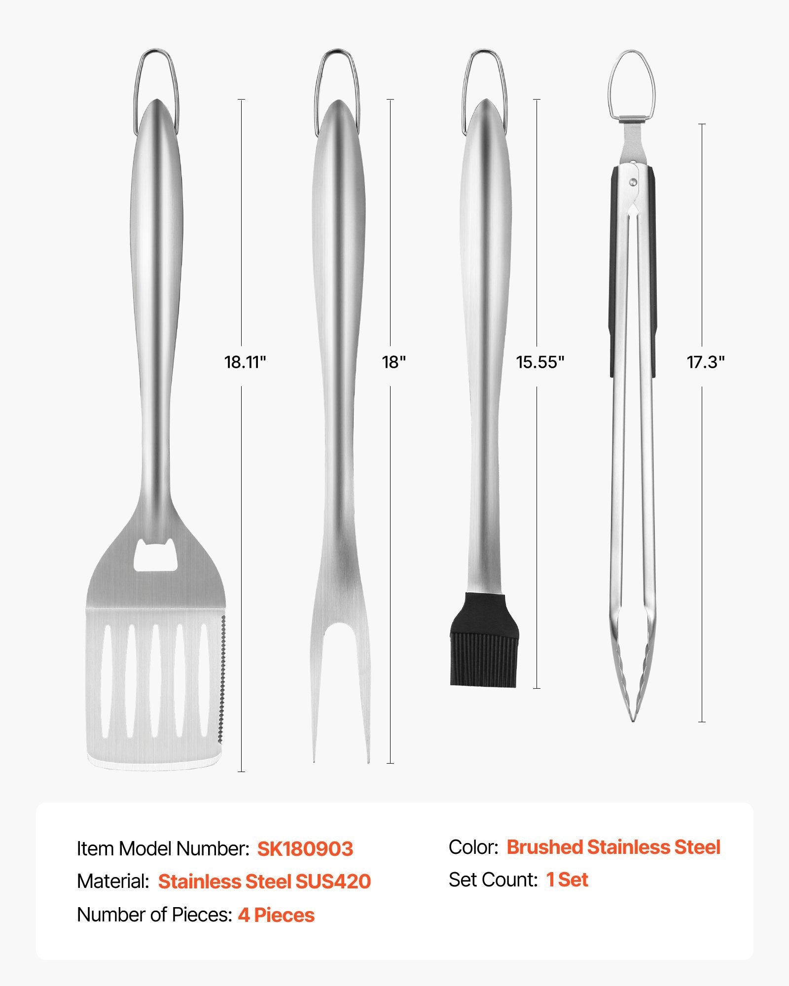 Featuring extra-long handles, these tools keep your hands safely away from the flames while giving you excellent control over your food. Convenient hanging hooks make storage simple and keep your tools within easy reach while cooking. Easy to clean, rust-resistant, and built to last, this four-piece set is as functional as it is sleek. Whether you’re grilling in the backyard, at a picnic, or on a camping trip, this set equips you with everything you need for a flawless barbecue experience.